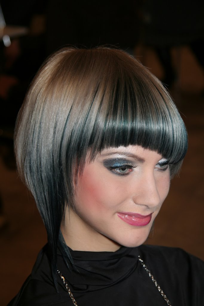 This design of bob can be very brief (appropriate at the ear) or much longer, under the chin. The style can offer the look that the woman has no bang, but the bangs are there, just long. They are normally swept sideways. There might be some light layering, or there might not be any layering at all, though the hair is normally straight (as with the traditional).